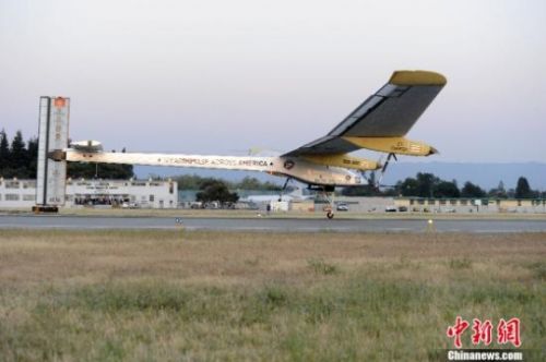 當?shù)貢r間5月3日清晨6時12分,美國宇航局位于加州山景城莫菲特機場,瑞士太陽能飛機“太陽能驅動”號起飛,開始歷史性的飛越美國大陸之旅!z影:陳鋼