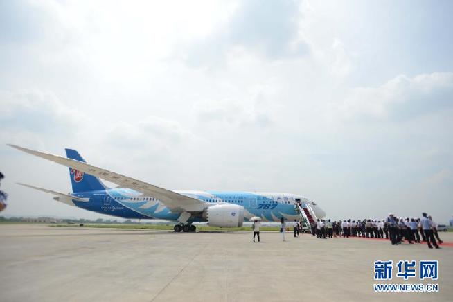 6月2日,南方航空公司在廣州白云機(jī)場舉辦接機(jī)儀式,宣布中國引進(jìn)的首架波音787夢想飛機(jī)正式啟動運(yùn)營。當(dāng)日,我國引進(jìn)的首架波音787夢想飛機(jī)飛抵廣州。 新華社記者 王建華 攝