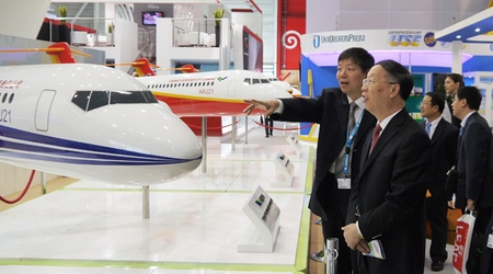 在中國商飛公司展區(qū),蘇波認真察看了C919大型客機混合級布局以及ARJ21-700飛機混合級、全經(jīng)濟級、行政機和公務(wù)機布局模型,聽取了公司兩大型號的最新研制進展、能力建設(shè)、人才隊伍建設(shè)、國際合作、民機產(chǎn)業(yè)體系建設(shè)等方面情況的匯報。蘇波表示,中國商飛公司成立5年來取得的成績令人鼓舞,工信部將一如既往地支持中國商飛公司的發(fā)展建設(shè),希望中國商飛公司再接再厲、奮力拼搏,爭取早日取得大型客機項目的成功。