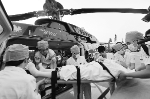昨日早上5時(shí)整,999直升機(jī)從密云機(jī)場起飛;5時(shí)23分,急救直升機(jī)抵達(dá)999清河急救中心停機(jī)坪。5分鐘后,救護(hù)車載著老人抵達(dá)。“慢點(diǎn)!慢點(diǎn)!讓開車門,小心直升機(jī)尾翼!”一位渾身包著繃帶、戴著頸托的老人被抬出了救護(hù)車,老人緊閉雙眼,顯得十分虛弱。擔(dān)架上的老人被小心翼翼地移上直升機(jī)。旋即,直升機(jī)騰空而起,前往天津?yàn)I海國際機(jī)場。