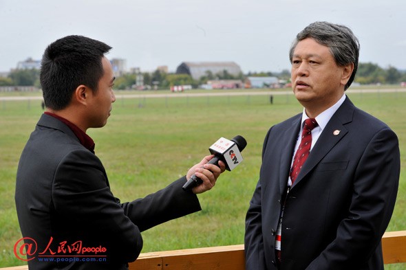 2013年8月27日上午,中國航空技術(shù)國際控股有限公司董事長馬福安(右)在第11屆莫斯科航展上接受中央電視臺記者采訪。 攝影:人民網(wǎng) 楊鐵虎