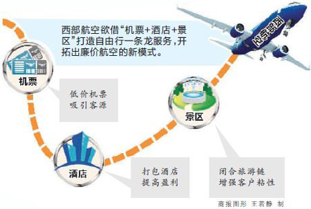 廉價(jià)航空如何構(gòu)建自己的商業(yè)生態(tài)?這是宣布轉(zhuǎn)型低成本后的西部航空的一大難題。昨日,商報(bào)記者獲悉,為打開局面,西部航空宣布拉長(zhǎng)產(chǎn)業(yè)鏈,進(jìn)軍旅游市場(chǎng),將重點(diǎn)打造“機(jī)票+酒店”的組合旅游模式,探路低成本航空運(yùn)作商業(yè)生態(tài)鏈。這意味著西部航空的盈利觸角,將延伸到下游的在線旅游市場(chǎng)。對(duì)此,在線旅游服務(wù)企業(yè)表示,歡迎航空公司打包產(chǎn)品通過他們來銷售,但航空公司若想壟斷資源來搶食,恐不受歡迎。
