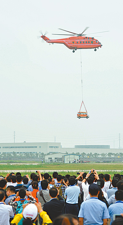 5日,開幕式上,飛行員駕駛13噸重的AC313直升機,模擬將交通事故中受損的車輛吊離現(xiàn)場。