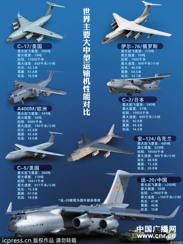 “運(yùn)-20”,機(jī)體長(zhǎng)47米,翼展45米,高15米,實(shí)用升限是13000米,最高載重量是66噸,最大起飛重量220噸,因此躋身全球十大運(yùn)力最強(qiáng)運(yùn)輸機(jī)之列!斑\(yùn)-20”的首次飛意味著中國空軍向戰(zhàn)略空軍邁出了堅(jiān)實(shí)的一步。