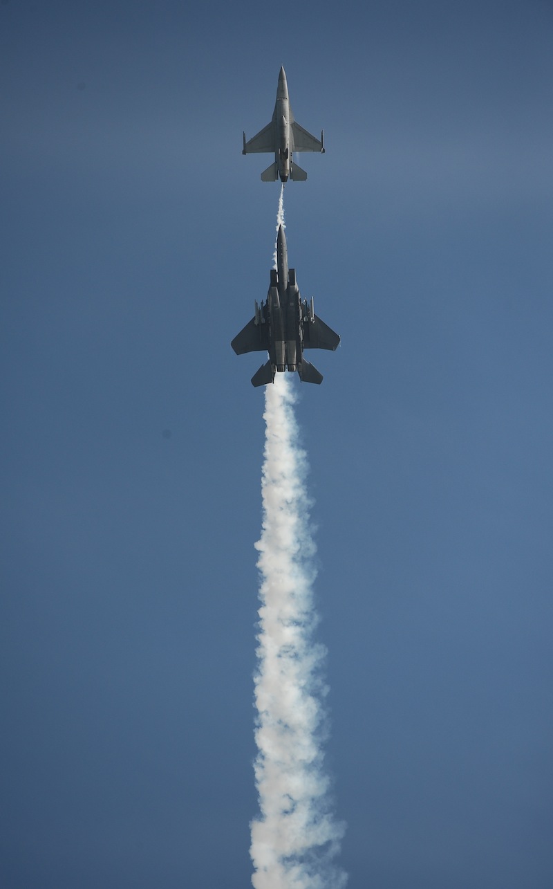 第三屆新加坡航展即將于2月14日正式開幕。新加坡空軍F-15SG型多用途戰(zhàn)斗機(jī)與F-16C型戰(zhàn)斗機(jī)緊鑼密鼓地進(jìn)行飛行預(yù)演。