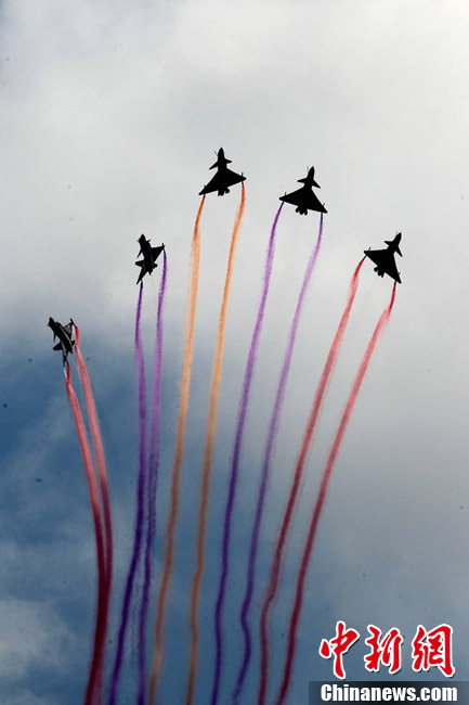 2012年11月10日,廣東省珠海市,八一飛行表演隊(duì)殲十戰(zhàn)機(jī)做編隊(duì)飛行練習(xí)。八一飛行表演隊(duì)將在珠海航展上做精彩編隊(duì)飛行表演。