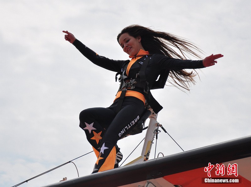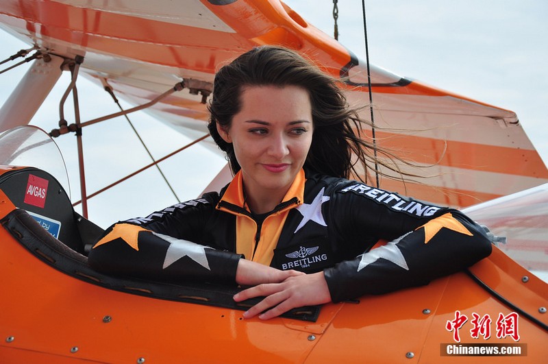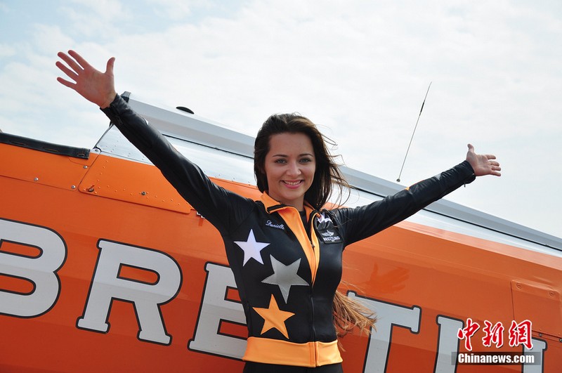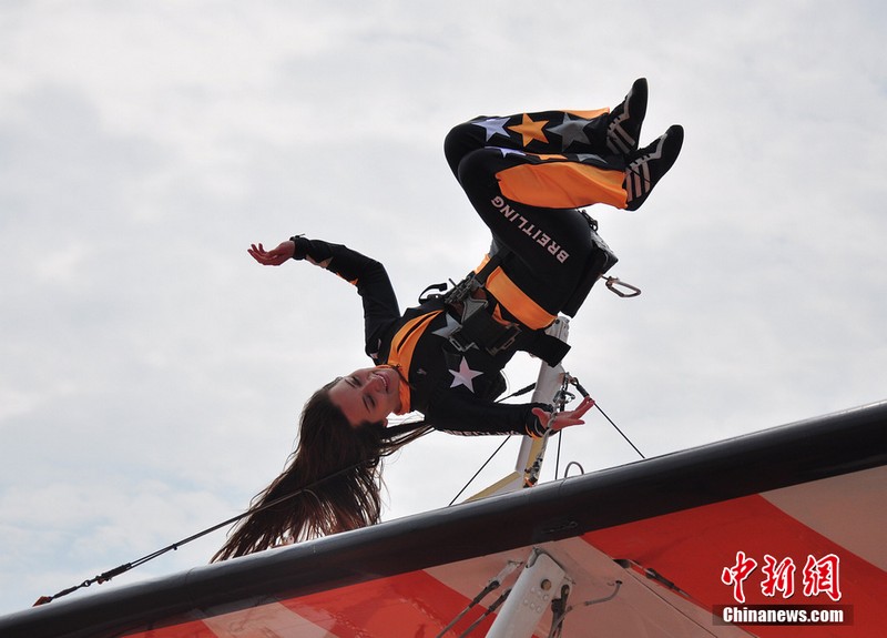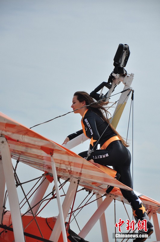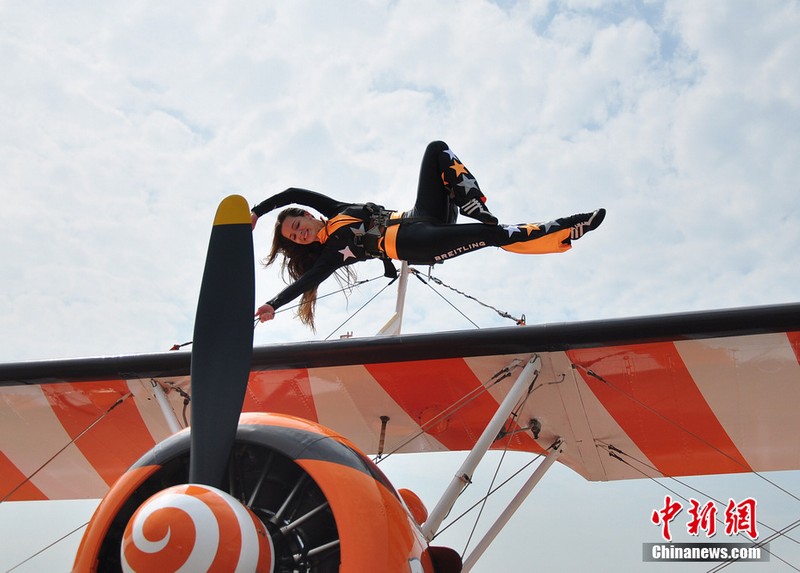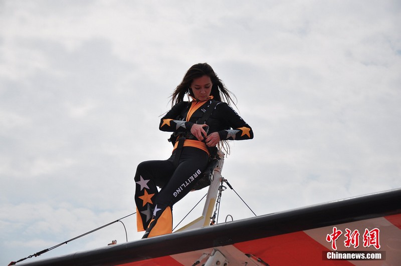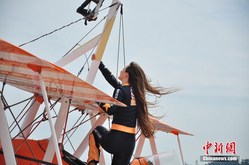 11月11日,歐洲“百年靈”機(jī)翼行走飛行表演隊(duì)的美女表演者在地面停放的飛機(jī)上進(jìn)行了表演動作展示。
