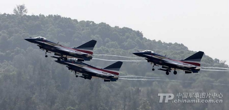 第9屆中國航空航天博覽會開幕在即。中國人民解放軍空軍八一飛行表演隊已到達珠海機場。 11月10日,珠海機場多云,八一飛行表演隊的飛行健兒進行了“熱身訓練”。記者在現(xiàn)場記錄了他們駕駛殲10戰(zhàn)機在云中穿梭的情景。親眼見證 “三機箭隊起飛”、“4機菱形隊斤頭”、“5、6號機繞軸滾轉(zhuǎn)”、“4機菱形放起落架斜盤旋”、“4機疊羅漢”等新增的高難度動作的風采。(來源:中國軍網(wǎng))