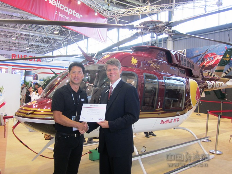 中國經(jīng)濟網(wǎng)珠海航展特派記者團訊 著名演員兼明星飛行員王敏德獲得貝爾直升機公司總裁兼首席執(zhí)行官約翰·加里森頒發(fā)“貝爾直升機中國大使”證書。王敏德將代表貝爾直升機公司出席各類活動。王敏德是一名合資格的飛行員, 持有貝爾直升機飛行執(zhí)照。