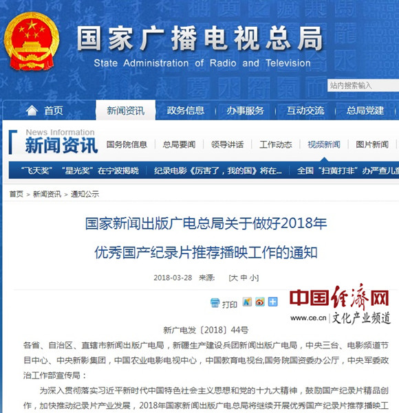 國家新聞出版廣電總局關(guān)于做好2018年優(yōu)秀國產(chǎn)紀(jì)錄片推薦播映工作的通知