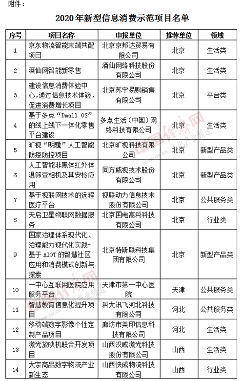 經(jīng)濟(jì)日報-中國經(jīng)濟(jì)網(wǎng)北京8月11日訊 日前,工業(yè)和信息化部公示了2020年新型信息消費示范項目,共100個項目入選。