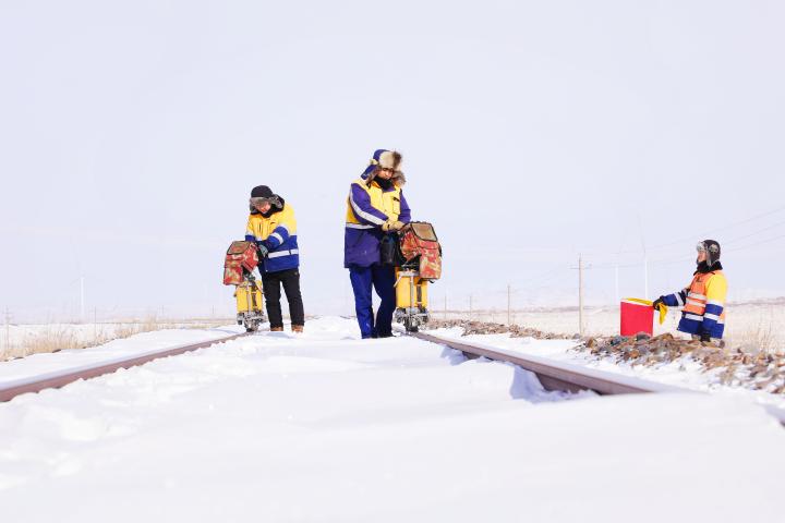 通遼工務(wù)段探傷車間路軌二工區(qū)負(fù)責(zé)通霍線以及錫烏線、霍白線等西部線路1000余公里的鋼軌探傷作業(yè),面對(duì)通霍及西部鐵路草原地區(qū)海拔高、紫外線強(qiáng)度高、晝夜溫差大、 “白毛風(fēng)”肆虐等特點(diǎn),“鋼軌醫(yī)生”沒有怨言始終堅(jiān)守,確保旅客列車及貨物列車的安全運(yùn)行?!敖裉烊蝿?wù)重,積雪厚,大家多留神!”班長郭夢(mèng)楠緊了緊防寒帽,呼出的白氣瞬間凝結(jié)。他和工友們抬著80多斤重的路軌超聲波探傷儀,深一腳淺一腳地踩在積雪中,每走一步都需用力拔腿。