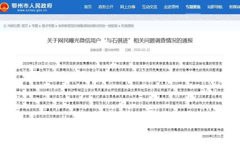 今天(22日)上午,鄂州市新型冠狀病毒感染肺炎疫情防控指揮部宣傳組在鄂州政府網(wǎng)發(fā)布《關(guān)于網(wǎng)民曝光微信用戶“與石俱進(jìn)”相關(guān)問題調(diào)查情況的通報(bào)》?!锻▓?bào)》顯示:經(jīng)查,微信用戶“與石俱進(jìn)”,姓名嚴(yán)某華,男,48歲、鄂州市燕磯鎮(zhèn)人,燕磯某個(gè)體小酒廠負(fù)責(zé)人。據(jù)其交待,發(fā)帖“本意是聊得好玩,想吸引別人的眼球”,圖片中的小西紅柿是在燕磯中百超市購買,食用油和大米是在當(dāng)?shù)匾患壹Z油店購買,口罩是網(wǎng)上截屏的,其妻子為家庭婦女,有三個(gè)小孩,兩個(gè)小孩在讀書,一個(gè)小孩只有2歲,其親屬中均沒有公務(wù)人員。