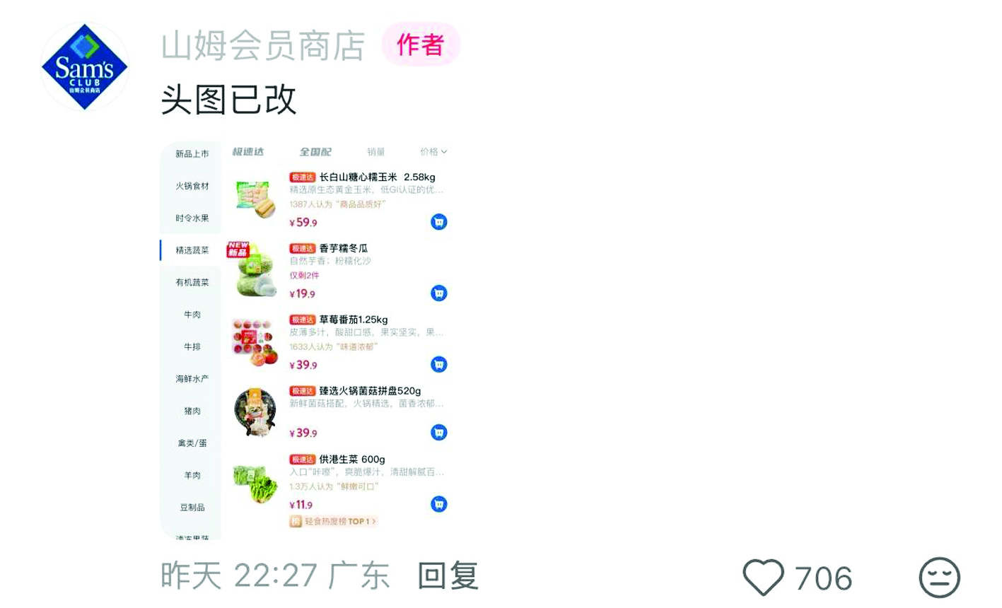“本次APP的改動(dòng)于今年8月底開(kāi)始上線進(jìn)行測(cè)試,并在期間持續(xù)根據(jù)會(huì)員的反饋進(jìn)行優(yōu)化。這兩天我們陸續(xù)收到了更多來(lái)自會(huì)員關(guān)于商品圖片等方面的寶貴建議,我們將會(huì)持續(xù)改進(jìn),以更好地展現(xiàn)商品的真實(shí)形態(tài)并提升體驗(yàn)。我們始終珍視會(huì)員的聲音,歡迎大家在‘山姆APP—我的—用戶調(diào)研—商品詳情頁(yè)調(diào)研’持續(xù)給予反饋。感謝大家的支持?!背酥?,山姆還在評(píng)論區(qū)配圖稱:“頭圖已改。”