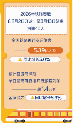 2026年鐵路春運自2月2日開始,至3月13日結(jié)束,為期40天,全國鐵路預(yù)計發(fā)送旅客5.39億人次、同比增長5.0%,節(jié)前客流高峰日預(yù)計為2月13日(農(nóng)歷臘月廿六),節(jié)后客流高峰日預(yù)計為2月23日(農(nóng)歷正月初七)。