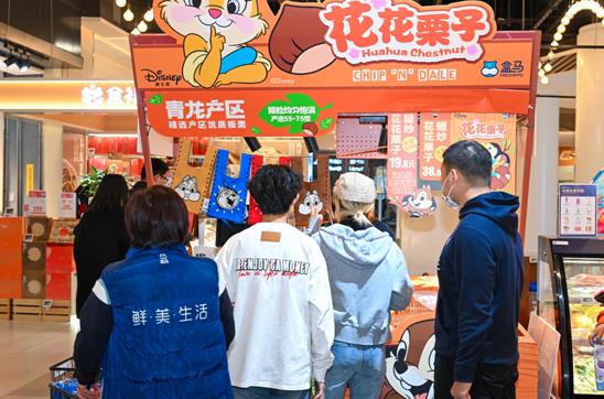 在哈一口氣便能凝結出霧的寒冬,暖呼呼的糖炒栗子最能溫暖人心。在午后的盒馬線下門店,糖炒栗子的檔口已經排起了長隊,工作人員將剛炒制出來的新鮮栗子裝進了印有迪士尼人物奇奇蒂蒂形象的紙盒里,遞給消費者?!疤鹛鹋磁吹睦踝?,最適合當冬天小零食”、“沖著這個包裝來買的,太可愛了?!?/p>