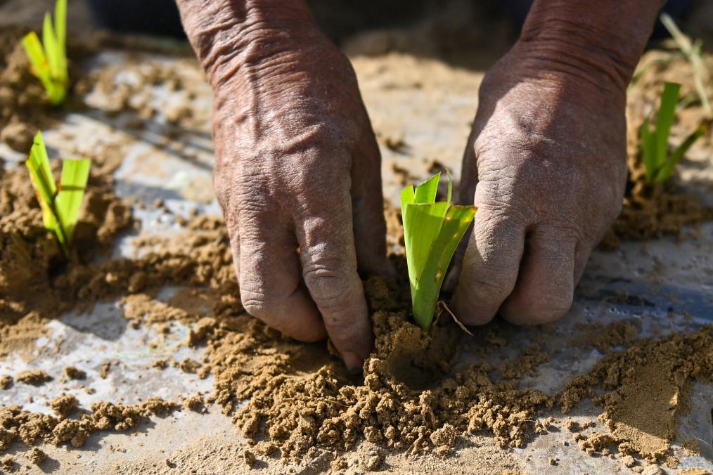 在新疆和田地區(qū)于田縣萬花園防沙治沙示范區(qū),當?shù)卮迕裨谠苑N射干(4月15日攝)。新華社記者 丁磊 攝