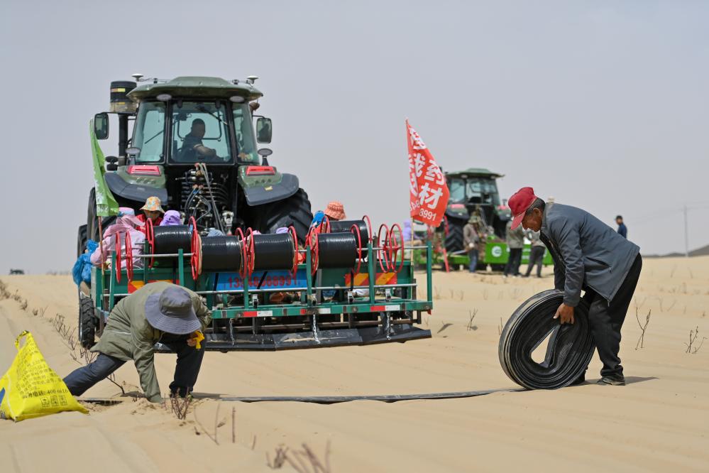在新疆和田地區(qū)于田縣闐東防沙治沙示范區(qū),當?shù)卮迕耨{駛機械移栽玫瑰和黃芩,并鋪設滴灌帶(4月15日攝)。 新華社記者 丁磊 攝