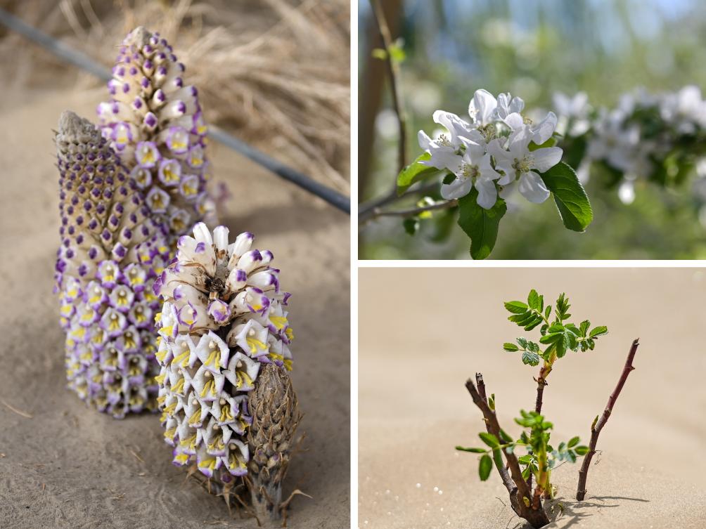 拼版照片:右上為在新疆阿克蘇豐慶園農民專業(yè)合作社示范園拍攝的蘋果花(4月14日攝);右下為在新疆和田地區(qū)于田縣闐東防沙治沙綜合示范區(qū)拍攝的玫瑰花苗(4月15日攝);左為在新疆仙草蓉科技有限公司防沙治沙荒漠植物示范園拍攝的肉蓯蓉(4月13日攝)。新華社記者 丁磊 攝