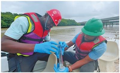 當?shù)貑T工在圭亞那新德梅拉拉河大橋旁進行水質(zhì)抽樣檢測?!”緢罄乐行姆稚?維娜·甘加丁攝