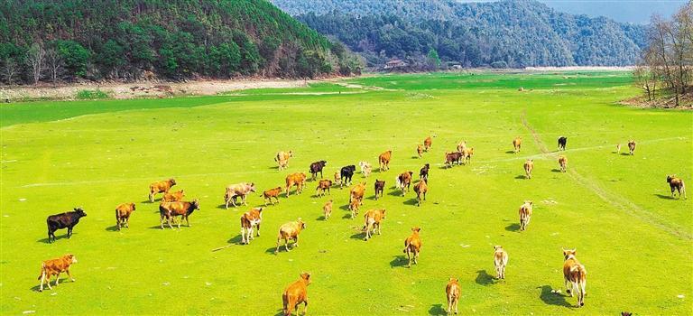 3月10日,江西省泰和縣橋頭鎮(zhèn)南車水庫(kù),成群的黃牛在草地上悠閑覓食。邱聯(lián)桂攝(中經(jīng)視覺(jué))
