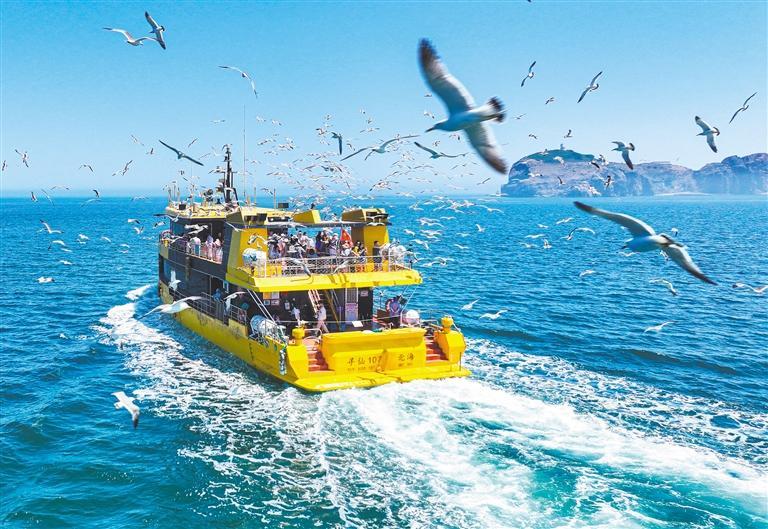 2025年6月23日,山東省榮成市成山鎮(zhèn)北部海域海驢島,游客乘船體驗(yàn)海上游,與黑尾鷗互動(dòng)。 李信君攝(中經(jīng)視覺(jué))