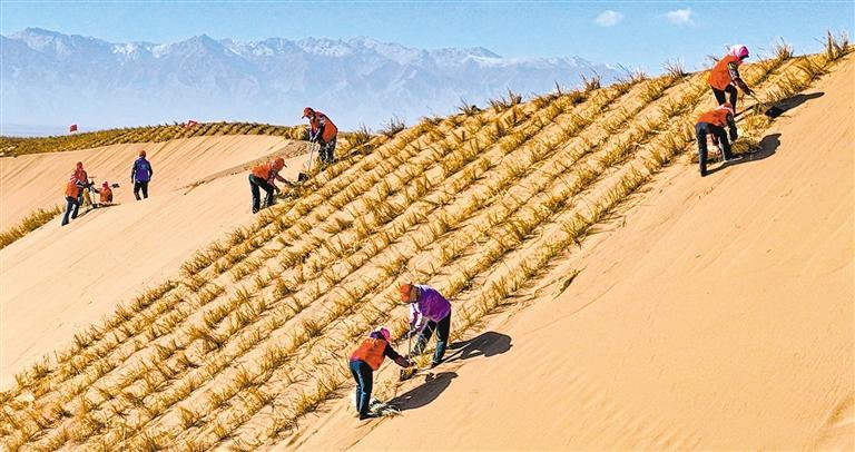 2025年11月13日,甘肅省肅南裕固族自治縣明花鄉(xiāng)西南部巴丹吉林沙漠南緣,治沙工人在沙丘上營(yíng)建沙障和固沙林帶,為沙漠“鎖邊”。 王 將攝 (中經(jīng)視覺(jué))