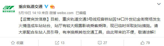近日,有消息稱因出現(xiàn)疑似病例,重慶軌道交通3號線觀音橋站被封。對此,5月19日14時,重慶市軌道交通(集團(tuán))有限公司@重慶軌道交通回應(yīng)稱,目前,重慶軌道交通3號線觀音橋站因1#口外世紀(jì)金街商場發(fā)生火情造成車站站臺、站廳有較大煙霧影響乘客乘降,現(xiàn)已臨時采取封站措施。????