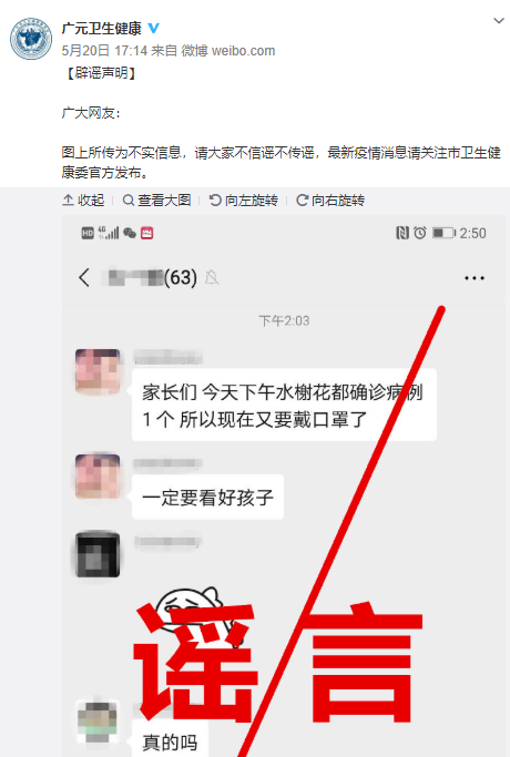 5月20日,四川省廣元市衛(wèi)生健康委員會官方微博@廣元衛(wèi)生健康發(fā)布辟謠聲明稱,網(wǎng)傳“廣元市水榭花都小區(qū)確診一新冠肺炎病例”為謠言。