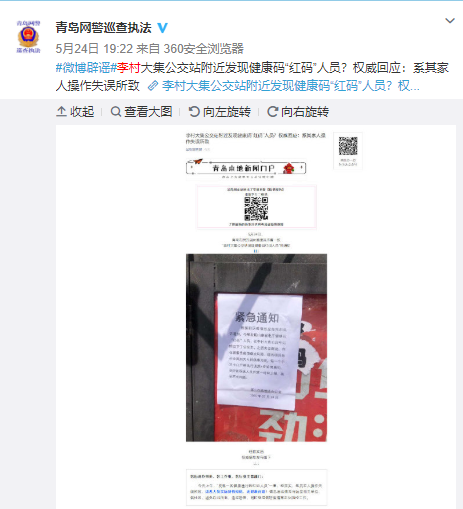 據(jù)半島都市報官微5月24日報道,針對“發(fā)現(xiàn)一名健康通行碼紅碼人員”一事,經(jīng)落實(shí),系其家人操作失誤所致,該名人員實(shí)際持有綠碼,無健康問題。此外,5月24日,山東省青島市公安局網(wǎng)絡(luò)警察支隊(duì)官方微博也對此傳言進(jìn)行了辟謠。