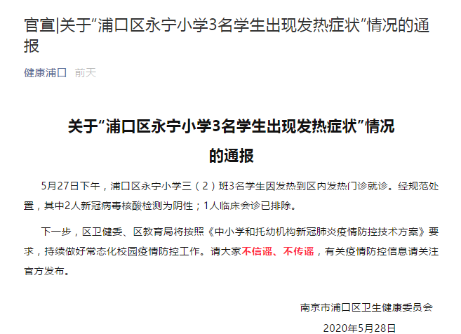 針對網絡傳言“南京浦口永寧小學發(fā)生聚集性疫情,導致全班停課。”5月28日, 南京市浦口區(qū)衛(wèi)生健康委員會官微“健康浦口”發(fā)布《關于“浦口區(qū)永寧小學3名學生出現發(fā)熱癥狀”情況》澄清事實。