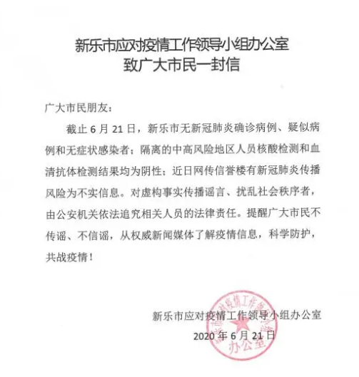 據(jù)河北省新樂市宣傳部官微21日消息,新樂市信譽樓有新冠肺炎傳播風(fēng)險為不實信息。截止6月21日,新樂市無新冠肺炎確診病例、疑似病例和無癥狀感染者;隔離的中高風(fēng)險地區(qū)人員核酸檢測和血清抗體檢測結(jié)果均為陰性。