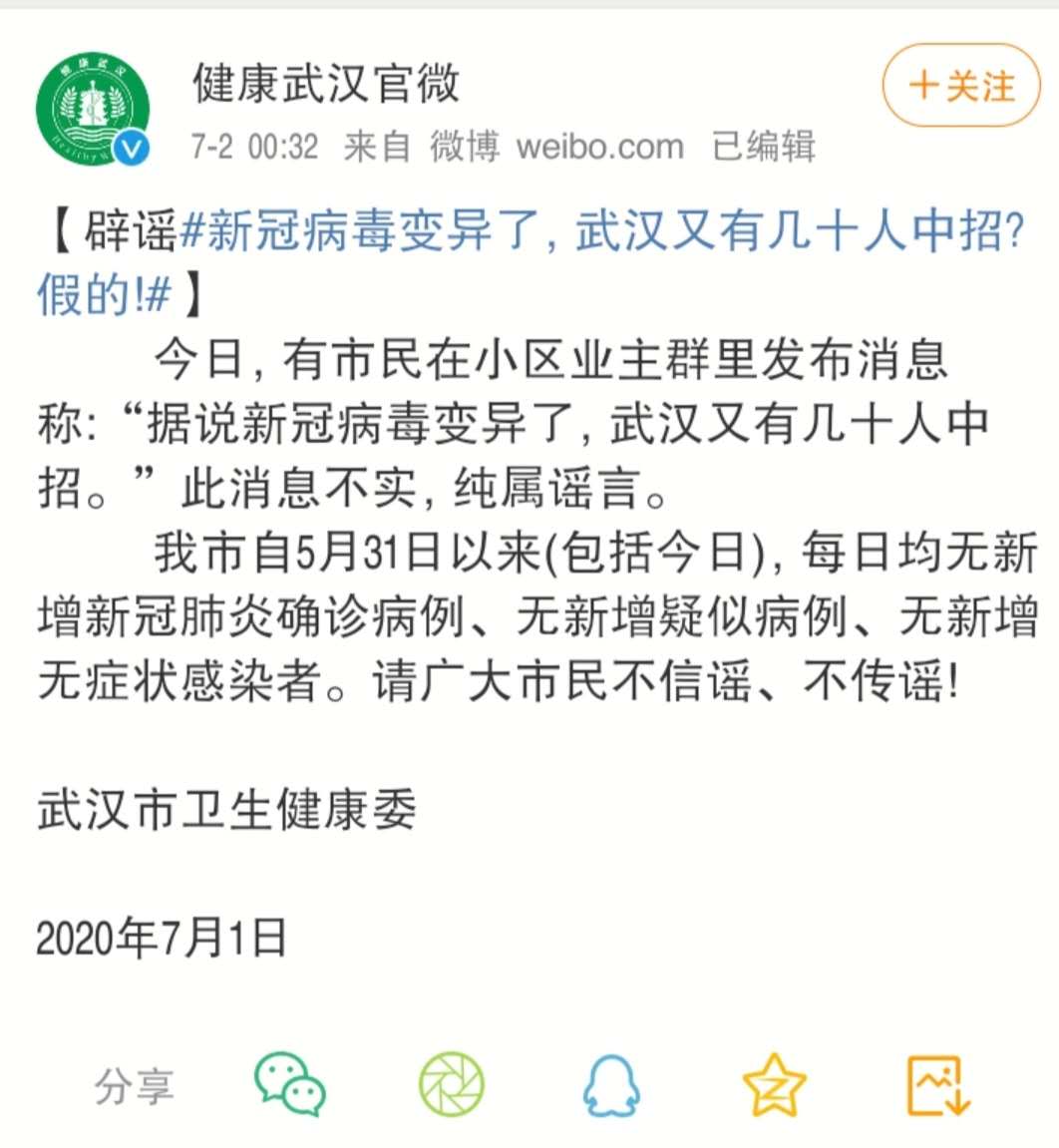 7月1日,武漢市衛(wèi)生健康委辟謠稱,此消息不實(shí),純屬謠言。武漢市自5月31日以來,每日均無新增新冠肺炎確診病例、無新增疑似病例、無新增無癥狀感染者。請廣大市民不信謠、不傳謠!