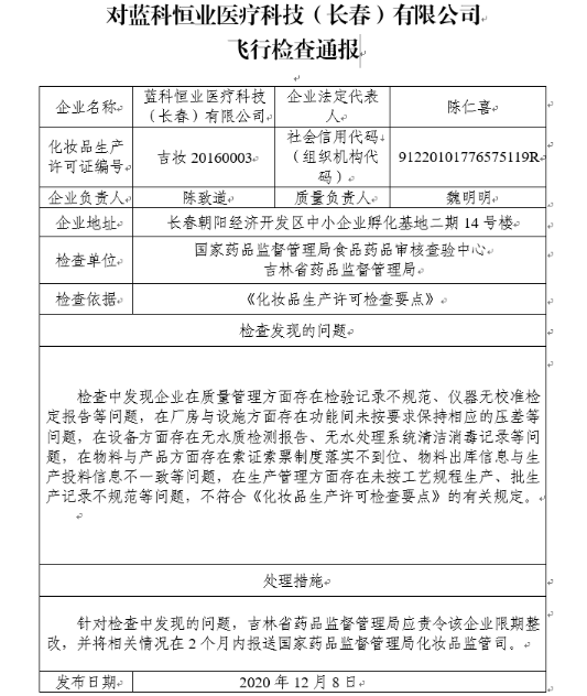 針對檢查中發(fā)現(xiàn)的問題,國家藥監(jiān)局要求吉林省藥品監(jiān)督管理局應(yīng)責令該企業(yè)限期整改,并將相關(guān)情況在2個月內(nèi)報送國家藥品監(jiān)督管理局化妝品監(jiān)管司。