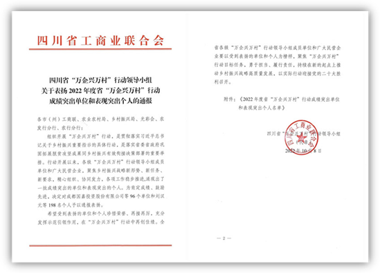 會上,表彰了2022年度“萬企興萬村”行動成績突出單位和表現(xiàn)突出個人。其中,全國人大代表、成都涼山商會會長、好醫(yī)生集團董事長耿福能受到四川省“萬企興萬村”行動領(lǐng)導小組通報表揚,獲評2022年度四川省“萬企興萬村”行動表現(xiàn)突出個人榮譽稱號。成都涼山商會常務副秘書長、好醫(yī)生集團鄉(xiāng)村振興工作組常務副組長謝芳福同獲表彰。