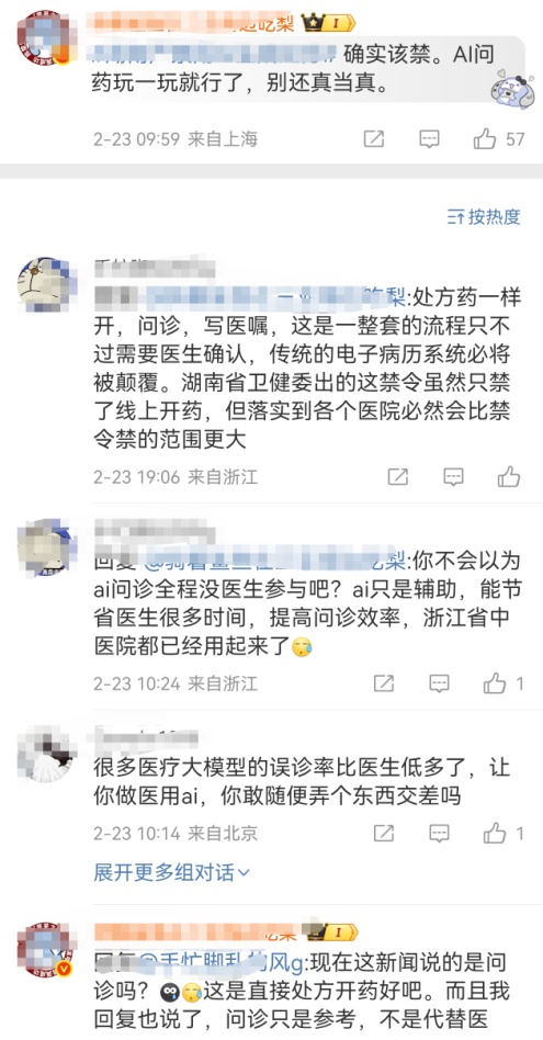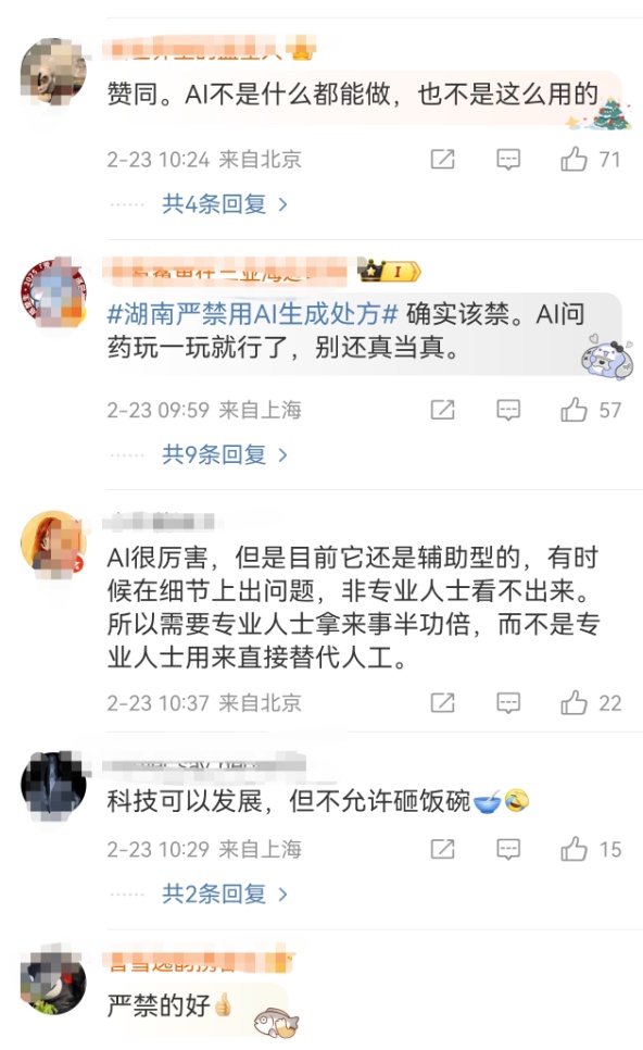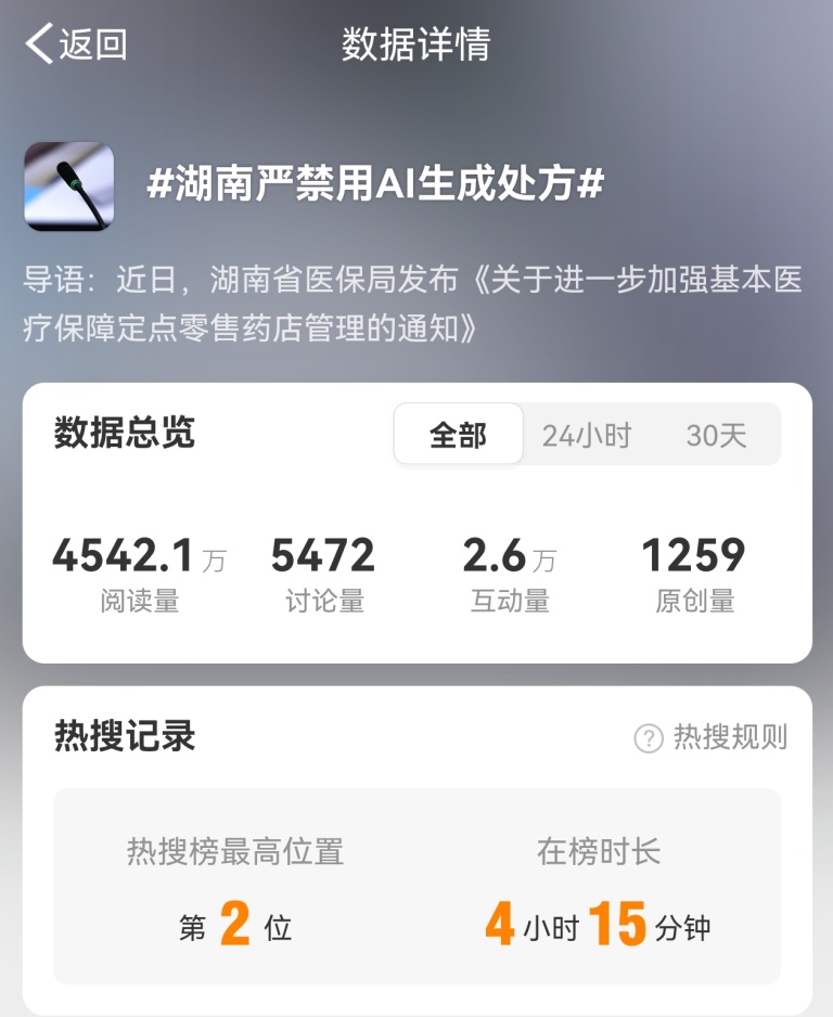 近日,湖南省醫(yī)療保障局發(fā)布《關(guān)于進一步加強基本醫(yī)療保障定點零售藥店管理的通知》,明確處方要求,嚴(yán)禁使用人工智能等自動生成處方。一時間,#湖南嚴(yán)禁用AI生成處方#話題沖上熱搜,閱讀量逾4500萬。