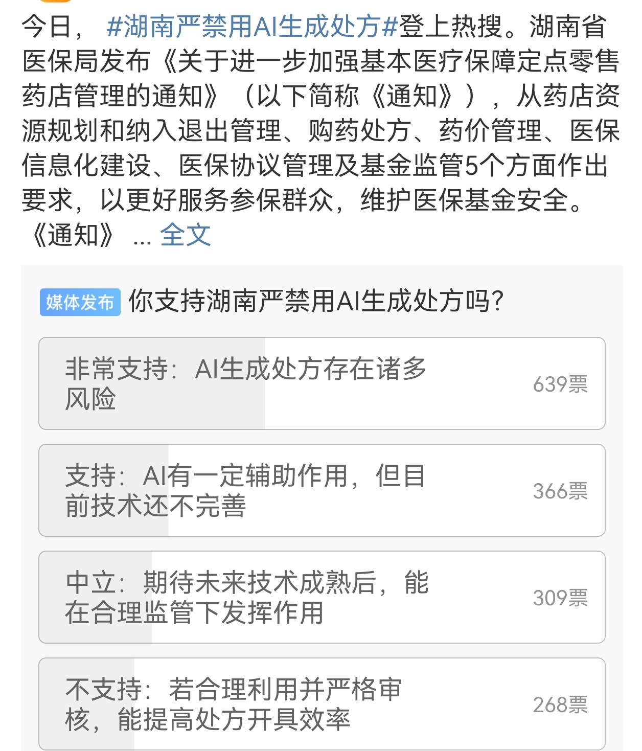記者注意到,隨著此話題發(fā)酵,人工智能自動生成處方這一議題,又展開了廣泛討論。在一媒體發(fā)起的微博投票中,“你支持湖南嚴(yán)禁用AI生成處方嗎”話題討論度頗大。其中,“非常支持”逾600票,“支持”逾300票,“中立”逾300票,“不支持”逾200票。