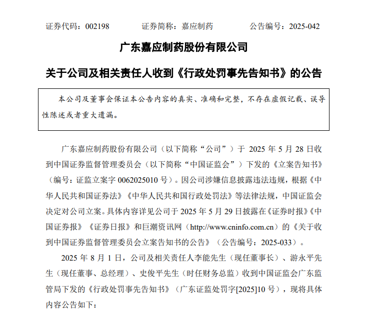 中國經(jīng)濟(jì)網(wǎng)北京8月5日訊(記者郭文培)8月4日,廣東嘉應(yīng)制藥股份有限公司(以下簡稱嘉應(yīng)制藥)披露公告,因2.2億元關(guān)聯(lián)資金拆借未及時披露,該公司及現(xiàn)任董事長李能、現(xiàn)任董事兼總經(jīng)理游永平、時任財務(wù)總監(jiān)史俊平收到中國證監(jiān)會廣東監(jiān)管局下發(fā)的《行政處罰事先告知書》,擬被處以共計(jì)490萬元罰款。