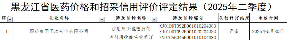 中國經(jīng)濟網(wǎng)北京85日訊(記者 郭文培)日前,黑龍江省公共資源交易中心發(fā)布《黑龍江省醫(yī)藥價格和招采信用評價評定結(jié)果的公示(2025年二季度)》。該中心對醫(yī)藥價格和招采失信事項目錄清單內(nèi)有悖誠實信用的行為開展了信用等級評定,國藥集團國瑞藥業(yè)有限公司被評為“嚴(yán)重失信”。
