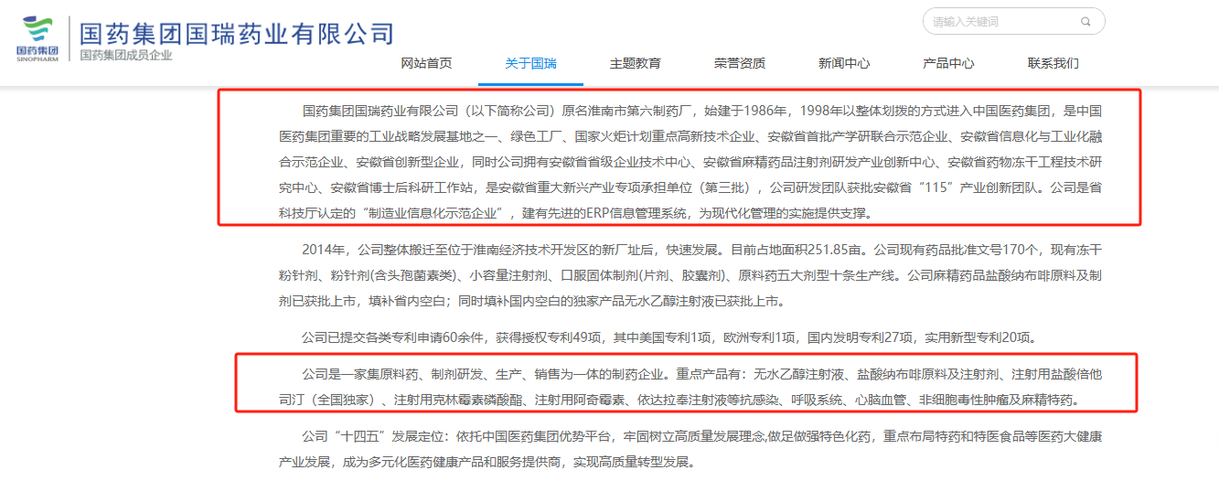 國藥集團國瑞藥業(yè)有限公司官網(wǎng)介紹,該公司原名淮南市第六制藥廠,始建于1986年,1998年以整體劃撥的方式進入中國醫(yī)藥集團,是中國醫(yī)藥集團重要的工業(yè)戰(zhàn)略發(fā)展基地之一。