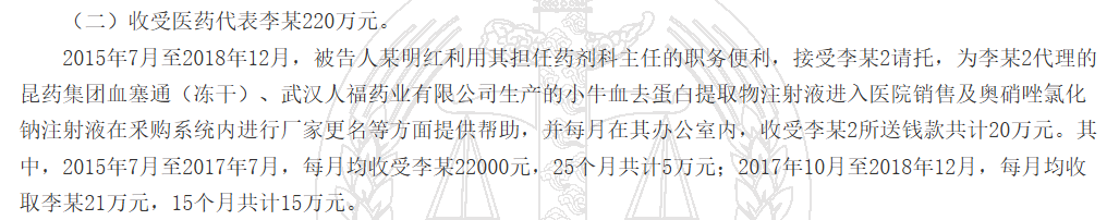 根據(jù)判決書,2015年7月至2018年12月,被告人某明紅利用其擔(dān)任藥劑科主任的職務(wù)便利,接受“李某2”請托,為“李某2”代理的昆藥集團血塞通(凍干)、武漢人福藥業(yè)有限公司生產(chǎn)的小牛血去蛋白提取物注射液進(jìn)入醫(yī)院銷售及奧硝唑氯化鈉注射液在釆購系統(tǒng)內(nèi)進(jìn)行廠家更名等方面提供幫助,并每月在其辦公室內(nèi),收受“李某2”所送錢款共計20萬元。