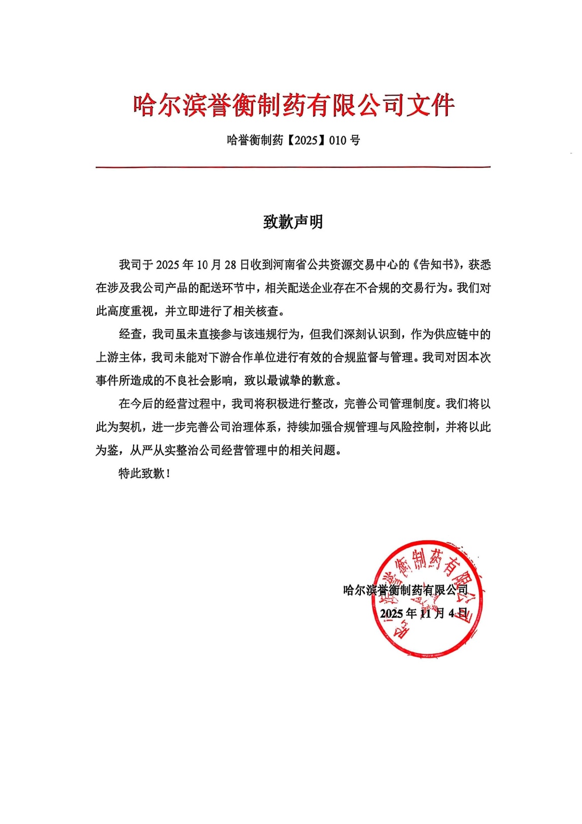 中國經濟網12月22日訊 日前,河南省醫(yī)藥集中采購平臺在其官網公示了三份藥企公開致歉信。哈爾濱譽衡制藥有限公司、吉林四環(huán)制藥有限公司、珠海經濟特區(qū)粵康醫(yī)藥有限公司分別就各自涉及的不合規(guī)交易行為公開致歉。
