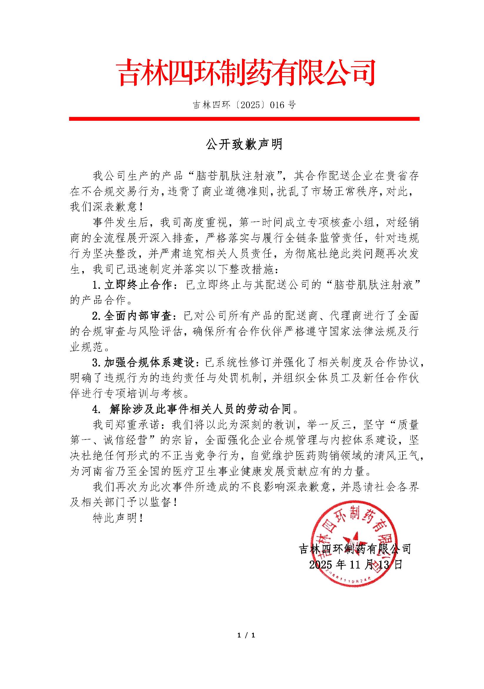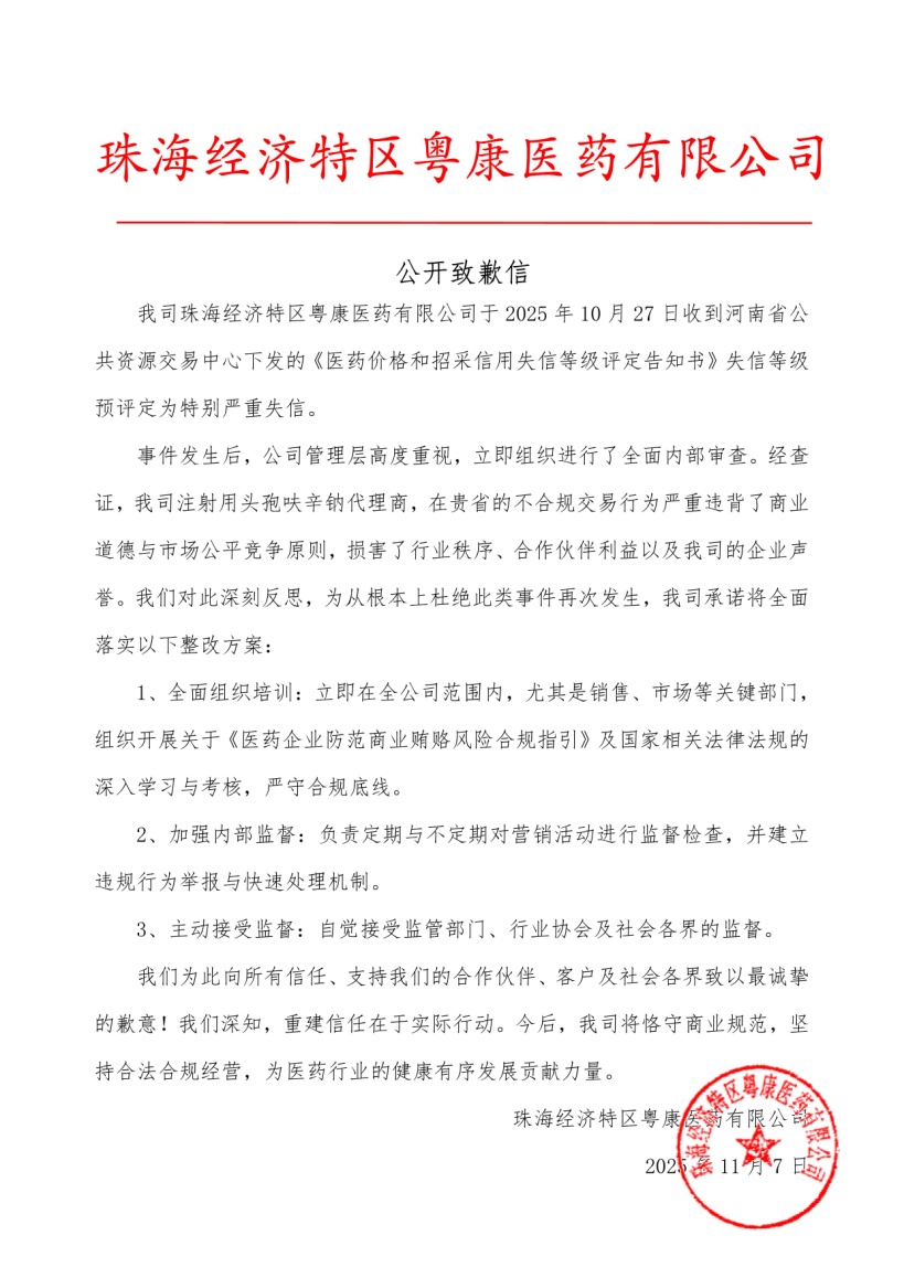 根據公開致歉信,在涉及哈爾濱譽衡制藥有限公司產品的配送環(huán)節(jié)中,相關配送企業(yè)存在不合規(guī)的交易行為。吉林四環(huán)制藥有限公司生產的產品“腦苷肌肽注射液”,其合作配送企業(yè)在河南省存在不合規(guī)交易行為。珠海經濟特區(qū)粵康醫(yī)藥有限公司注射用頭孢呋辛鈉代理商,在河南省發(fā)生不合規(guī)交易行為,粵康醫(yī)藥收到河南省公共資源交易中心下發(fā)的《醫(yī)藥價格和招采信用失信等級評定告知書》失信等級預評定為特別嚴重失信。