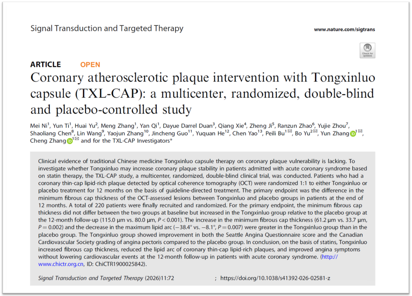 2月24日,“通心絡(luò)膠囊干預(yù)急性冠脈綜合征冠狀動脈粥樣硬化斑塊的隨機、雙盲、安慰劑平行對照、多中心臨床研究(TXL-CAP多中心研究)”論文在施普林格?自然集團(Springer Nature)主管的國際權(quán)威學(xué)術(shù)期刊《信號轉(zhuǎn)導(dǎo)與靶向治療》(Signal Transduction and Targeted Therapy,簡稱STTT,影響因子52.7)在線發(fā)表。結(jié)果顯示,在他汀等現(xiàn)代標(biāo)準(zhǔn)治療基礎(chǔ)上聯(lián)合使用通心絡(luò),可顯著增加急性冠狀動脈綜合征患者冠狀動脈易損斑塊纖維帽厚度,減小斑塊脂質(zhì)弧度,并改善心絞痛癥狀,為臨床穩(wěn)定冠狀動脈斑塊提供了有效的治療手段。