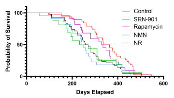 此次試驗耗時數(shù)年,以18月齡(約相當于人類50多歲)自然衰老的正常小鼠為研究對象,持續(xù)觀察至其自然死亡。結(jié)果顯示,接受SRN-901治療的小鼠中位剩余壽命延長33%,死亡風險降低46%。