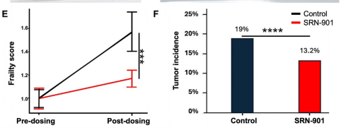 研究團隊還采用24項臨床虛弱指數(shù)評估體系量化健康狀態(tài),結(jié)果表明SRN-901使小鼠衰老速度減緩70%,腫瘤發(fā)病率也下降了30.53%。