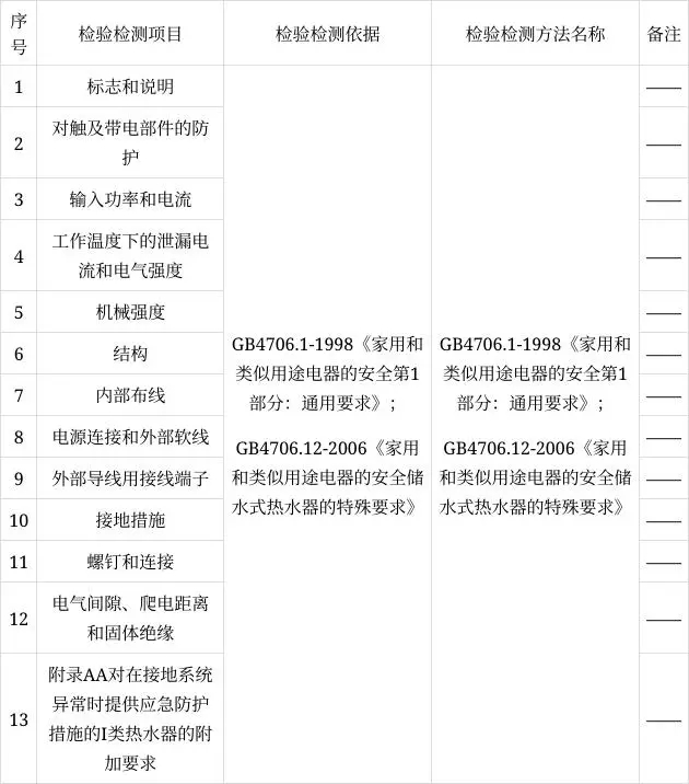 表2 儲水式電熱水器產(chǎn)品檢驗檢測項目及依據(jù)