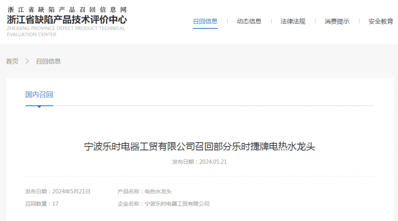 日前,寧波樂時電器工貿(mào)有限公司受缺陷調(diào)查影響按照《消費品召回管理暫行規(guī)定》的要求,主動向浙江省市場監(jiān)督管理局和寧波市市場監(jiān)督管理局報告了召回計劃,將自即日起,召回2023年5月27日至2023年5月28日期間制造的樂時捷牌ST1X3型號電熱水龍頭,涉及數(shù)量為17件。