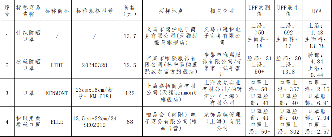 檢測發(fā)現,45款樣品中,4款樣品不符合標準要求,例如標稱由義烏市遮護電子商務有限公司生產銷售的針織防曬口罩,其實測UPF值僅18(主面料),T(UVA)AV值高達13.78(主面料);其余41款樣品UPF>40并且T(UVA)AV<5%,防曬性能良好。