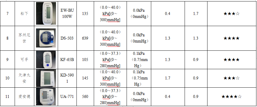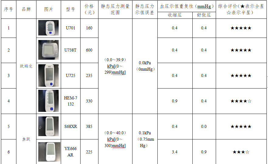 此次比較試驗(yàn)選取不同品牌的11款樣品,分別是歐姆龍(U701、U738T、U725、HEM-7132),魚躍(S68XR、YE666AR),松下(EW-BU100W),蘇州尼世(DS-503),可孚(KF-65B),天津九安(KD-5901)以及愛(ài)安德(UA-771)。測(cè)試依據(jù)JJG 692—2010《無(wú)創(chuàng)自動(dòng)測(cè)量血壓計(jì)檢定規(guī)程》,檢測(cè)靜態(tài)壓力測(cè)量范圍、靜態(tài)壓力示值誤差和血壓示值重復(fù)性等技術(shù)指標(biāo),通過(guò)數(shù)據(jù)展現(xiàn)各品牌型號(hào)樣品的性能參數(shù),為消費(fèi)者選購(gòu)提供參考。